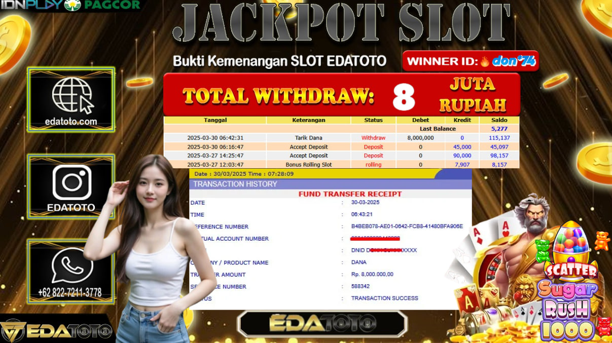 Selamat Kepada Pemilik user ID : don*74 Hari/Tanggal : Sabtu / 30 , MARET 2025 Jackpot : Rp. 8.000.000 JT . . .