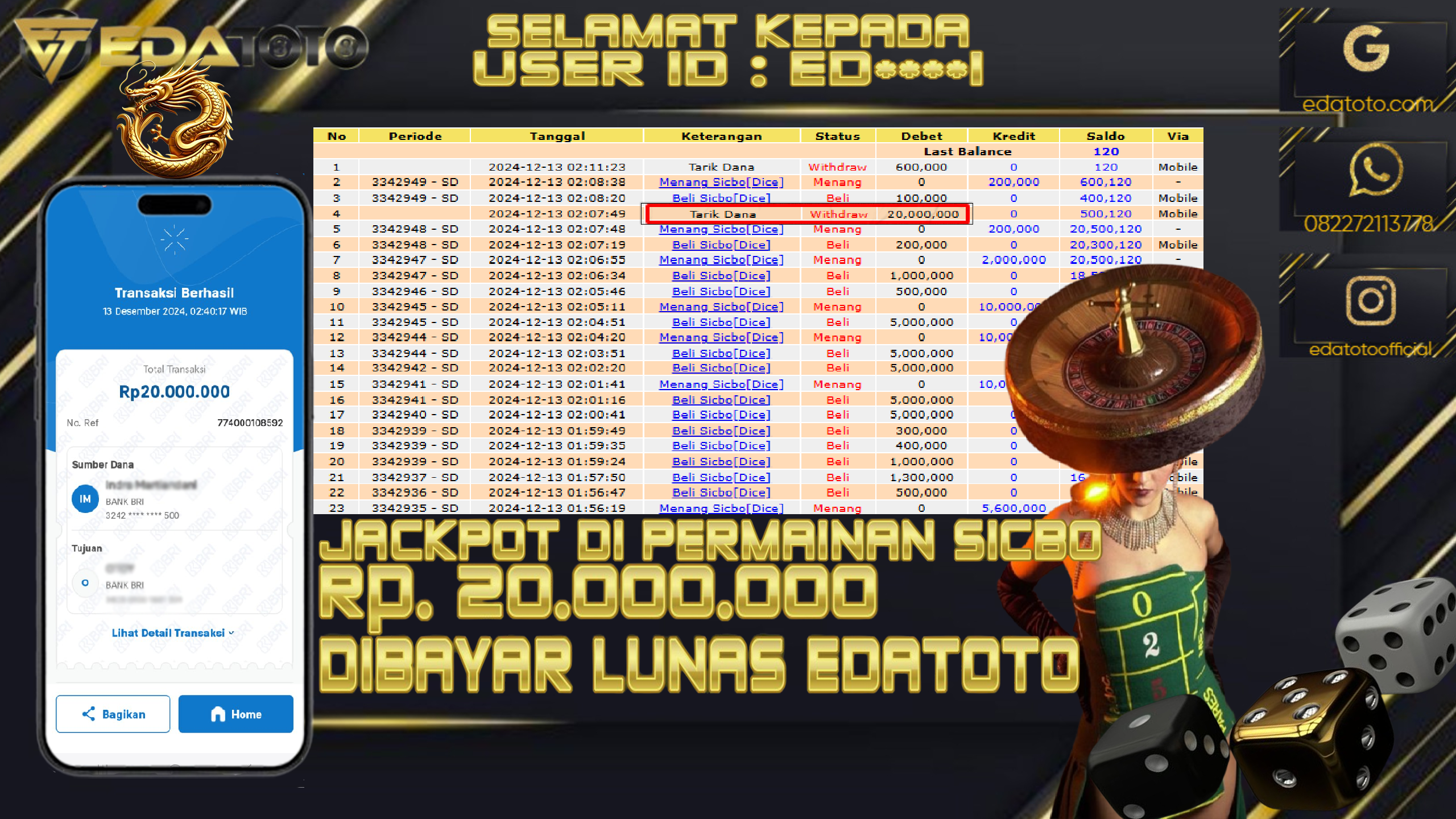 Selamat Kepada Pemilik user ID : ED*****I Hari/Tanggal : Jumat/ 12 DESEMBER 2024 Jackpot : Rp. 20.000.000 JT Permainan . . .