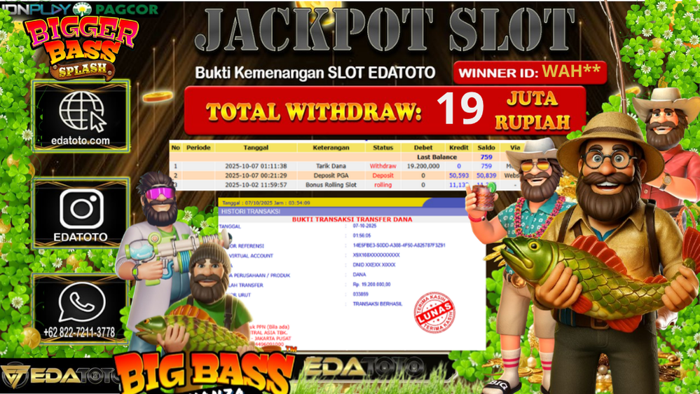 Kepada Pemilik user ID : Wah** Hari/Tanggal : Selasa/ 07, Oktober 2025 Jackpot : Rp. 19.200.000 JT Permainan : Big Bass . . .