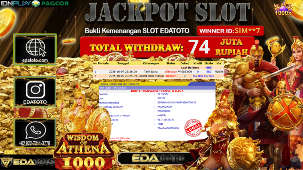 Kepada Pemilik user ID : Sim**7 Hari/Tanggal : Rabu/ 08, Oktober 2025 Jackpot : Rp. 74.085.000 JT Permainan :Wisdom Of Athena . . .