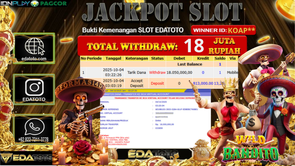 Selamat Kepada Pemilik user ID : koap** Hari/Tanggal : Sabtu/ 04, Oktober 2025 Jackpot : Rp. 18.050.000 JT Permainan :Wild Bandito . . .