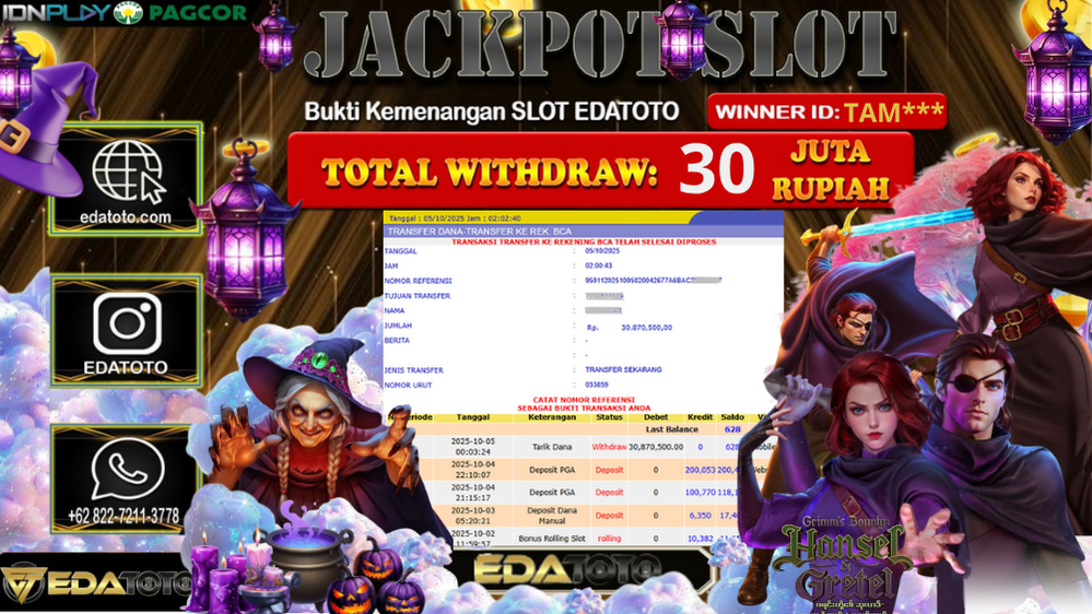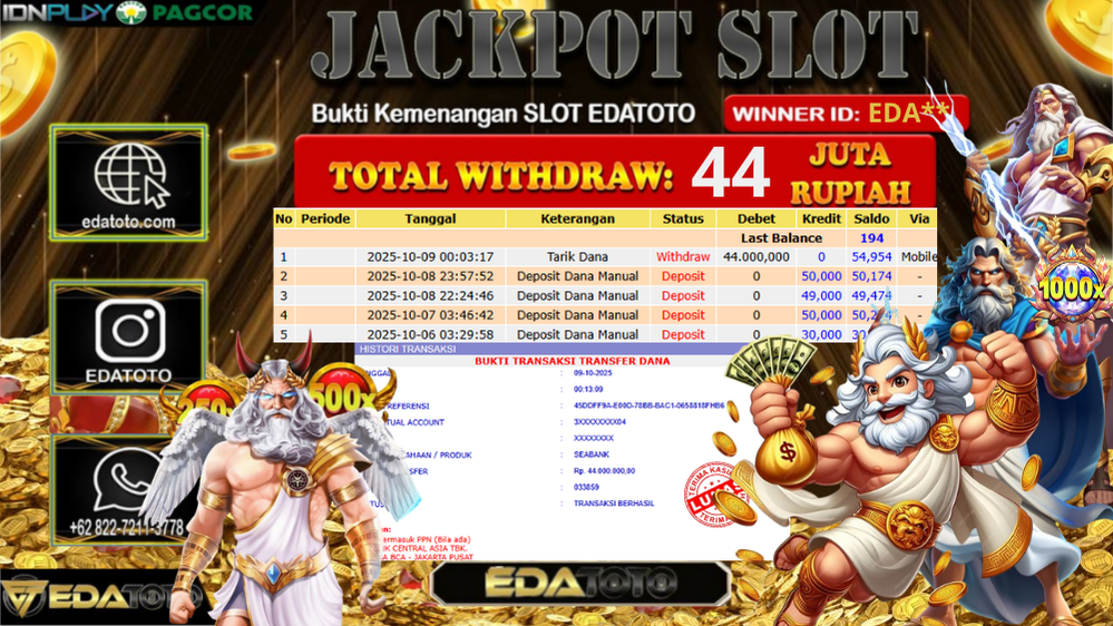 Selamat Kepada Pemilik user ID : EDA** Hari/Tanggal : kamis/ 09, Oktober 2025 Jackpot : Rp. 44.000.000 JT Permainan : . . .