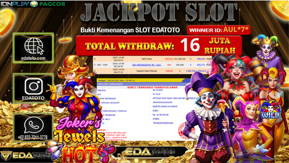 Selamat Kepada Pemilik user ID : aUL*7* Hari/Tanggal : Senin/ 06, Oktober 2025 Jackpot : Rp. 16.168.220 JT Permainan : Joker’s . . .