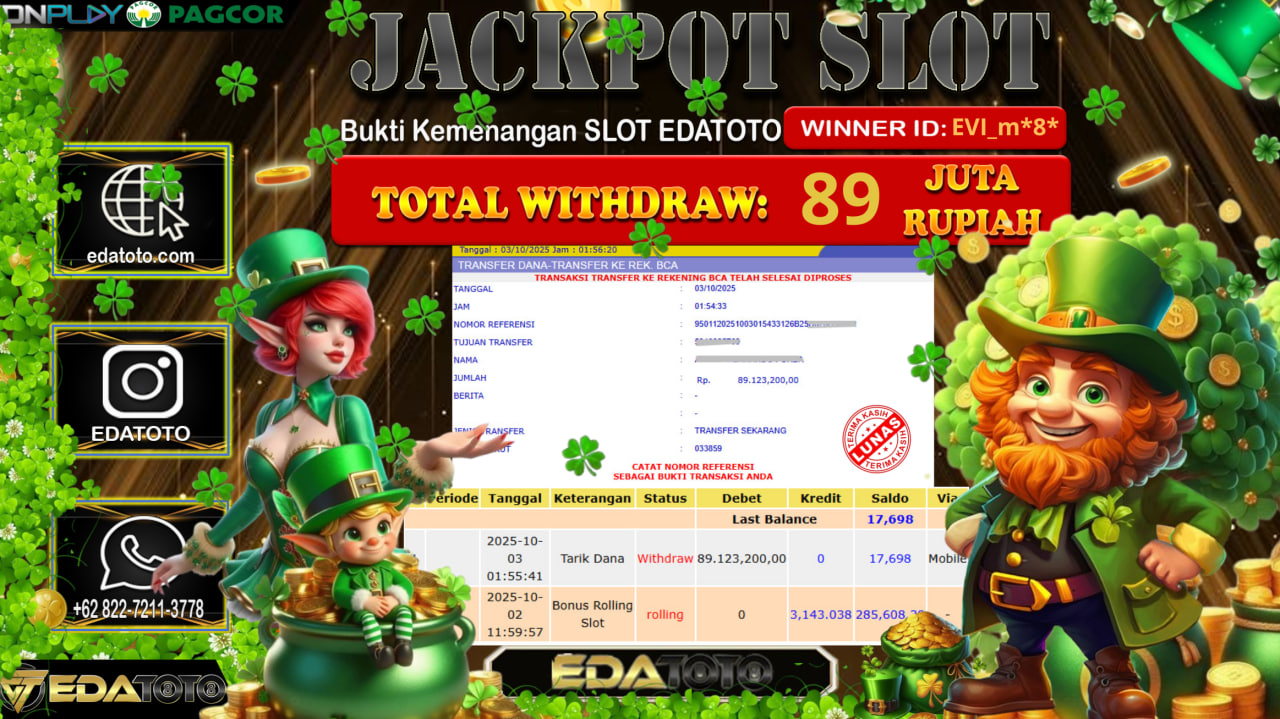 Selamat Kepada Pemilik user ID : EVI_m*8* Hari/Tanggal : Kamis/ 03, Oktober 2025 Jackpot : Rp. 89.123.200 JT Permainan : Gold . . .