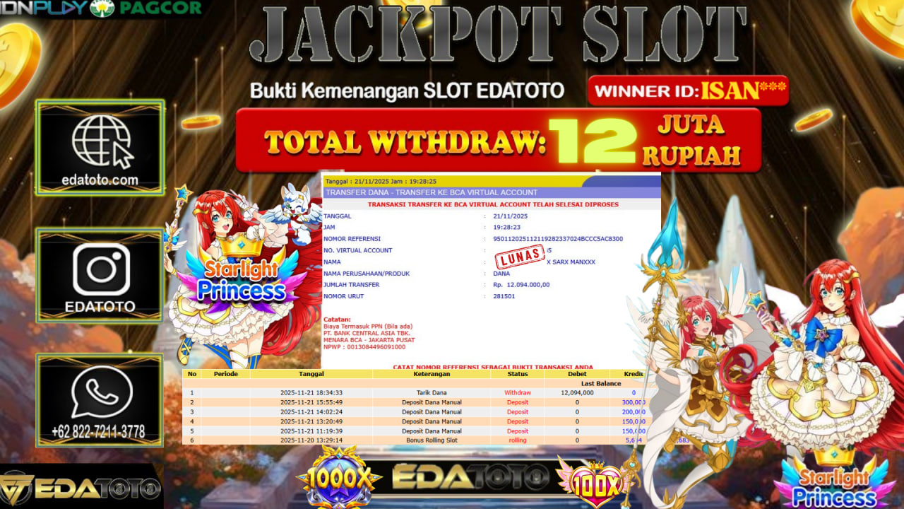Selamat Kepada Pemilik user ID : ISAN*** Hari/Tanggal :Senin / 23, November 2025 Jackpot : Rp. 12,094,000 JT Withdraw :14,500,000 . . .