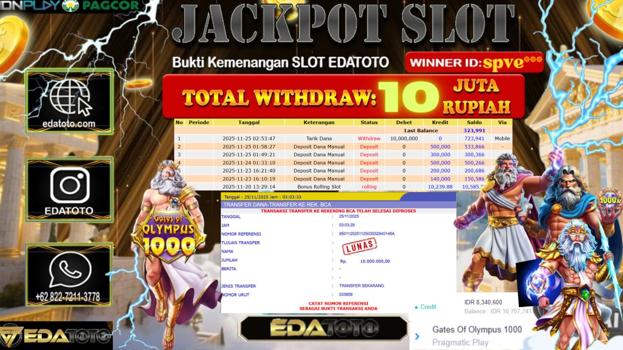 Selamat Kepada Pemilik user ID : SPVE*** Hari/Tanggal :Selasa / 24, November 2025 Jackpot : Rp. 8,340,600 JT Withdraw :10,000,000 . . .